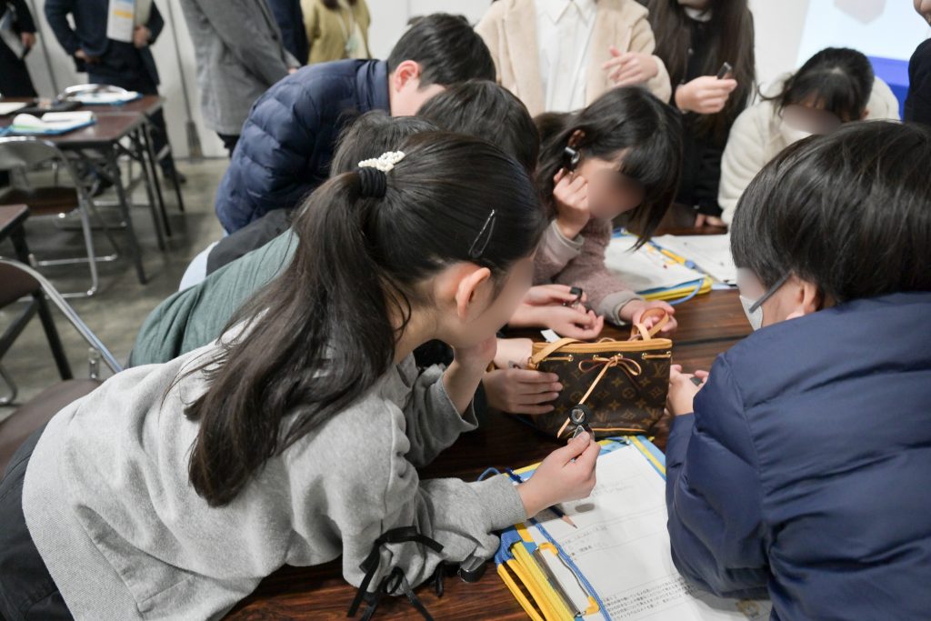 当日は、KOMEHYOが実際に取り扱うパールやダイヤモンドを使い、ルーペを用いた鑑定体験を実施しました。 さらに、AI真贋によるブランドバッグの鑑定も実演。