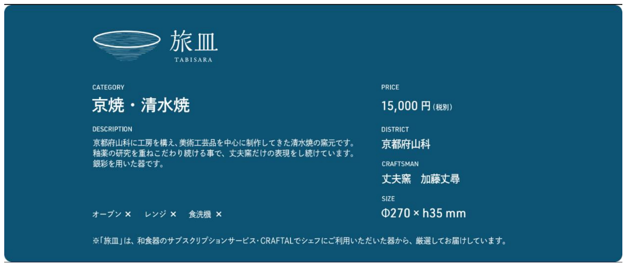 これまで、和食器は二次流通の市場が未成熟であったため、多くのホテルや飲食店で使い終えた器が無価値として廃棄されている現状がありました。「旅皿」は、この捨てられるはずだった器を再流通させ、一流の料理人が選び、愛用した経緯を「旅」に見立て、そのストーリーを付加価値として伝えることで、器の価値を高めて販売しています。取り扱う器は、主に京焼・清水焼や九谷焼など伝統工芸のつくり手が生み出した和食器で、Culture Generation Japanが運営する飲食店向け和食器のサブスクリプションサービス「CRAFTAL」で使用した“日本全国の窯元や陶芸作家の上質な作品”です。これにより、つくり手にも継続的に経済効果が還元される仕組みを実現しています。